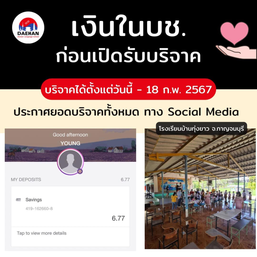 จำนวนเงินสดและเงินโอนทุกบาทจะบริจาคทั้งหมด ไม่หักค่าใช้จ่าย หากมียอดบริจาคเกิน 30,000+ + จะแบ่งไปมอบทุนการศึกษาเพิ่มเติม (เราจะประชุมกับทางโรงเรียนบ้านทุ่งยาวอีกครั้งหนึ่ง)