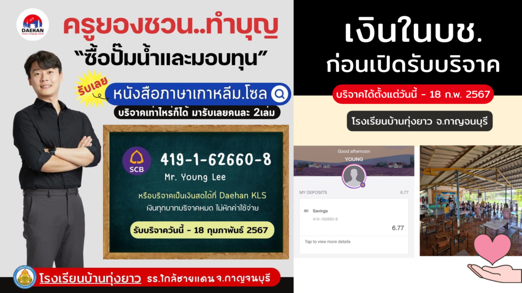 และถ้าหากยอดบริจาคไม่พอกับค่าปั๊มน้ำทางโรงเรียนแดฮันจะสมทบเพิ่มเข้าไปให้ครบตามจำนวน ![]()